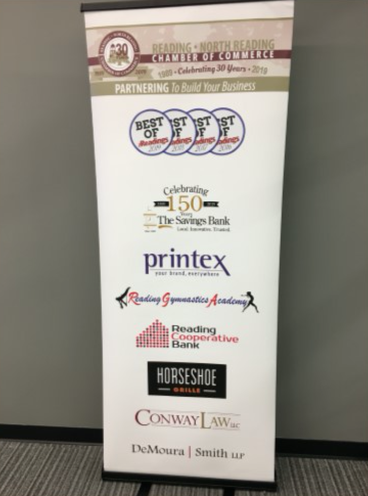 Visibility Banner – $500: Make thousands of impressions by sponsoring our visibility banner. Your logo will be featured on a vertical banner featured at 15+ Chamber networking, lunches and educational events from July 2026 — June 2027. Limited to 10.